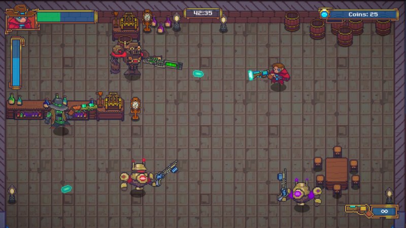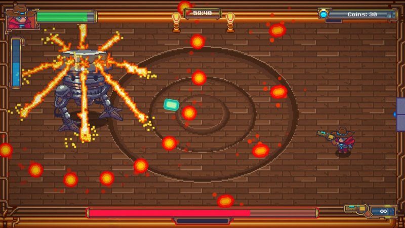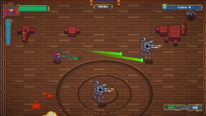 Описание игры: В The Legend of Cyber Cowboy вам предстоит отправиться во вселенную, в которой стимпанк напрямую встречается с киберпанком. История разворачивается вокруг стрелка с механизированной рукой, которому предстоит очистить город от банд, использующих продвинутые технологии в ущерб мирным жителям. Сюжет погружает в атмосферу футуристического Дикого Запада, и здесь враги могут носить как киберимпланты, так и цилиндры с моноклями. Игровой процесс построен в формате твин-стик шутера с видом сверху. Противники атакуют волнами, причем среди них киборги и причудливые механические твари. Игроку предстоит использовать как арсенал оружия, так и особенности окружения. Разрушаемые объекты могут стать временным укрытием или ловушкой для врагов. Дополнительную мобильность обеспечивает энергетический рывок, позволяющий уходить от смертельных атак. Каждое новое прохождение разворачивается в пяти уникальных мирах, созданных процедурно. Локации включают пыльные пустоши, шумные салуны и другие тематические зоны, при этом их внутренняя структура меняется с каждой попыткой. Внутри уровней можно находить магазины, где за собранные энергетические жетоны удастся приобрести улучшенное вооружение. Финалом каждого мира становятся напряженные схватки с крупными боссами.