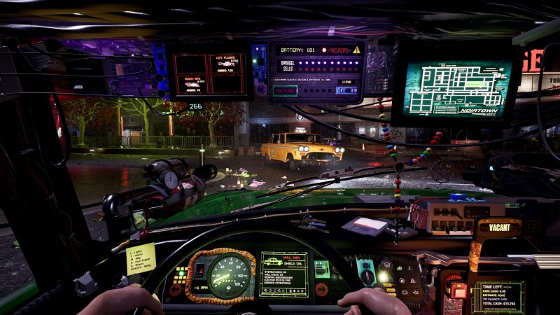 Описание игры: CyberTaxi: Lunatic Nights - погружение в мрачную, тревожную реальность антиутопического мегаполиса, где каждая улица хранит свою историю, а каждый поворот может стать началом опасного испытания. Действие разворачивается в городе-тюрьме Prison City, пропитанном атмосферой упадка, насилия и безысходности. Вы - таксист, но ваши цели далеко выходят за рамки обычных пассажирских перевозок: нужно спасти сестру, несправедливо оказавшуюся за решеткой. Миссия станет центром, вокруг которого закручивается клубок событий, наполненный рискованными заданиями, внезапными схватками и моральными выборами. Каждая поездка в симуляторе - это отдельная история. В один день вам предстоит доставить горячую пиццу в целости и сохранности, лавируя между разбитыми дорогами и враждебными кварталами, в другой - искать потерявшихся кошек в заброшенных церковных зданиях, где тишину прерывает лишь эхо шагов. Вождение здесь ощущается живым и настоящим: топливо на исходе, батарея садится быстрее под дождем, а внезапный туман может скрыть опасность за пару метров. Погода в игре динамична, и она не просто создаёт атмосферу — она меняет правила игры, заставляя приспосабливаться к новым условиям каждую минуту. Визуально игра балансирует между стилем поздних 80-х и начала 90-х и суровой динамикой уличных боев. Яркие неоновые вывески соседствуют с обветшалыми зданиями, а музыка и звуковое оформление усиливают ощущение тревоги. Вам часто придется защищать себя и свой автомобиль от нападений - вооруженные преступники, бандитские группировки и агрессивные пассажиры создают постоянную угрозу. Система апгрейдов брони и вооружения позволяет превратить ваше такси в настоящую боевую машину, но даже с максимальной защитой каждое столкновение может стать фатальным. Пассажиры являются отдельной гранью этой истории. Они реагируют на ваше вождение, комментируют происходящее и оценивают ваши навыки. Кто-то будет благодарен за аккуратную поездку, а кто-то - раздражен задержкой или резким маневром. Эти детали делают игру живой: вы чувствуете, что управляете не просто транспортом, а частью большого, дышащего города. Иногда задания заставляют выйти из машины, чтобы обследовать районы пешком. Именно так вы будете открывать доступ к мини-играм, поиску коллекционных предметов и лута, который может пригодиться в дальнейшем. Симуляция вождения здесь проработана до мелочей. Рабочие фары, дворники, подвеска - все это не просто декоративные элементы, а механики, влияющие на процесс. Особая система "бережной доставки" проверяет вашу аккуратность: повредите груз - потеряете часть награды. На станциях техобслуживания можно менять детали, улучшать характеристики и готовить машину к опасным миссиям. А когда дело доходит до автомобильных боев, игра превращается в напряженный экшен, где каждое столкновение сопровождается взрывами, искрами и криками. В итоге каждая поездка становится чем-то большим, чем просто перемещение из точки А в точку Б.