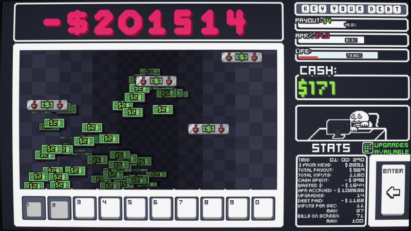 Описание игры: В основе игры Key Your Debt простая задача: закрыть долг, используя только цифровой блок клавиатуры. Каждый запуск сводится к постоянному набору чисел, управлению доходом и борьбе с растущими штрафами. Давление идет через саму систему: долг висит постоянно, проценты продолжают капать, ошибка в темпе сразу бьет по общему прогрессу. Главная механика - быстрый ввод цифр на numpad. Нажимая нужные клавиши и удерживая высокий темп, вы зарабатываете виртуальные деньги. Параллельно нужно следить за показателями, потому что одного набора мало: заработок уходит на выплату долга, а сам долг может расти из-за процентов. А еще нужно решать, когда просто фармить, а когда вкладываться в улучшения, чтобы повысить доход, ослабить давление системы. Дополнительно игра мешает чистому набору через помехи и ограничения. Здесь есть сильный Life Drain, давление со стороны APR и препятствия, которые сбивают ритм и делают процесс заметно сложнее. Поэтому цикл строится вокруг трех вещей: быстро нажимать, правильно тратить заработанные деньги и адаптироваться к ухудшению условий. Key Your Debt - жесткий механический челлендж с упором на тактику и реакцию.